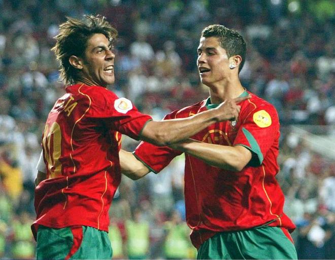 2004年欧洲杯揭幕战对阵希腊。C罗头球破门,打进个人欧洲杯首球,成为当时欧洲杯首秀破门最年轻的球员。