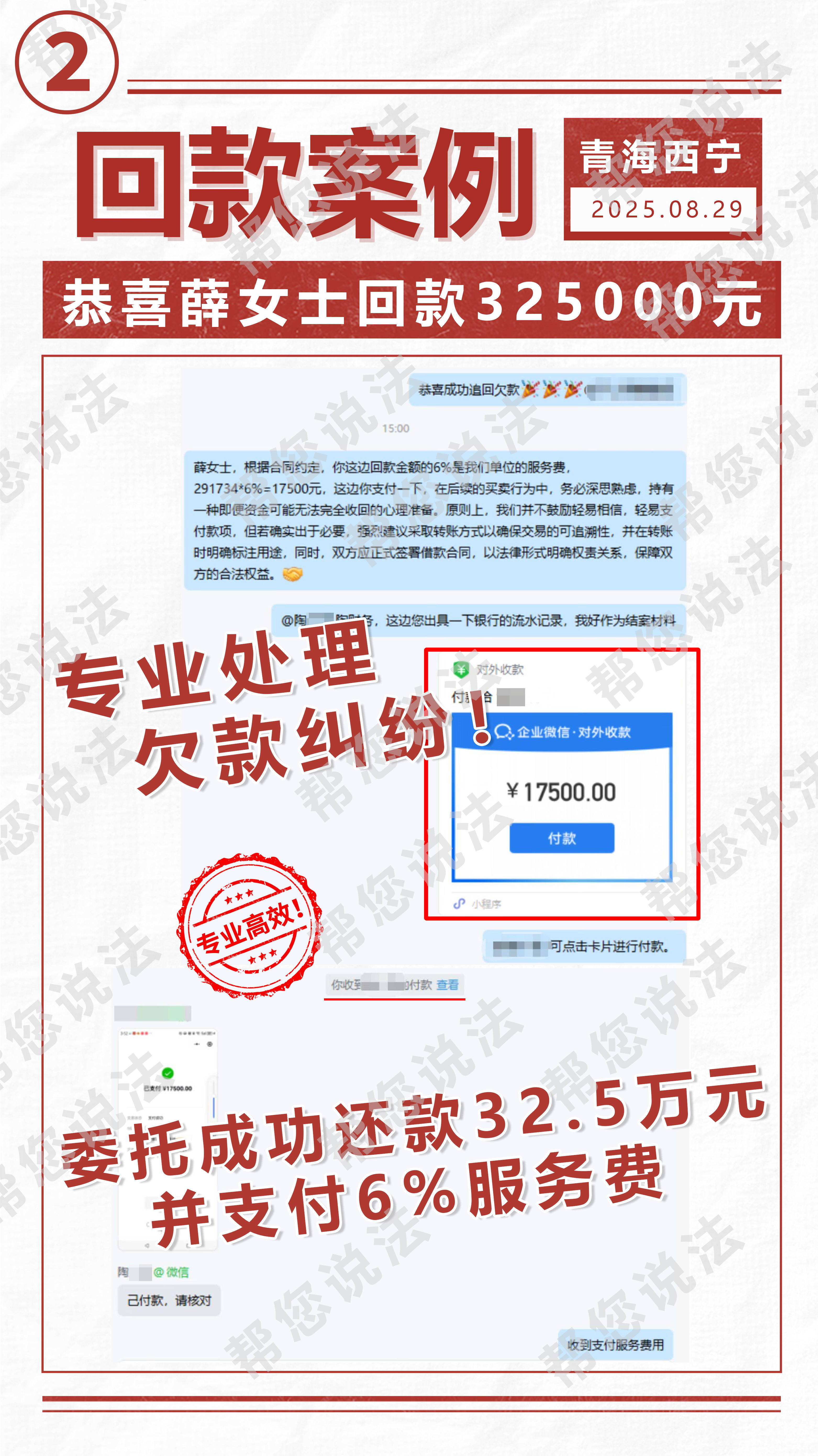 在服务过程中,团队始终紧扣客户的实际需求,提供从案情分析、证据整理到诉讼文书撰写的一站式法务支持,而且每个步骤都有资深律师全程参与指导把关,旨在通过专业、快捷的诉讼辅助服务,为债务纠纷的妥善解决筑牢根基。以下是帮赢说法的部分经典成功案例展示。
