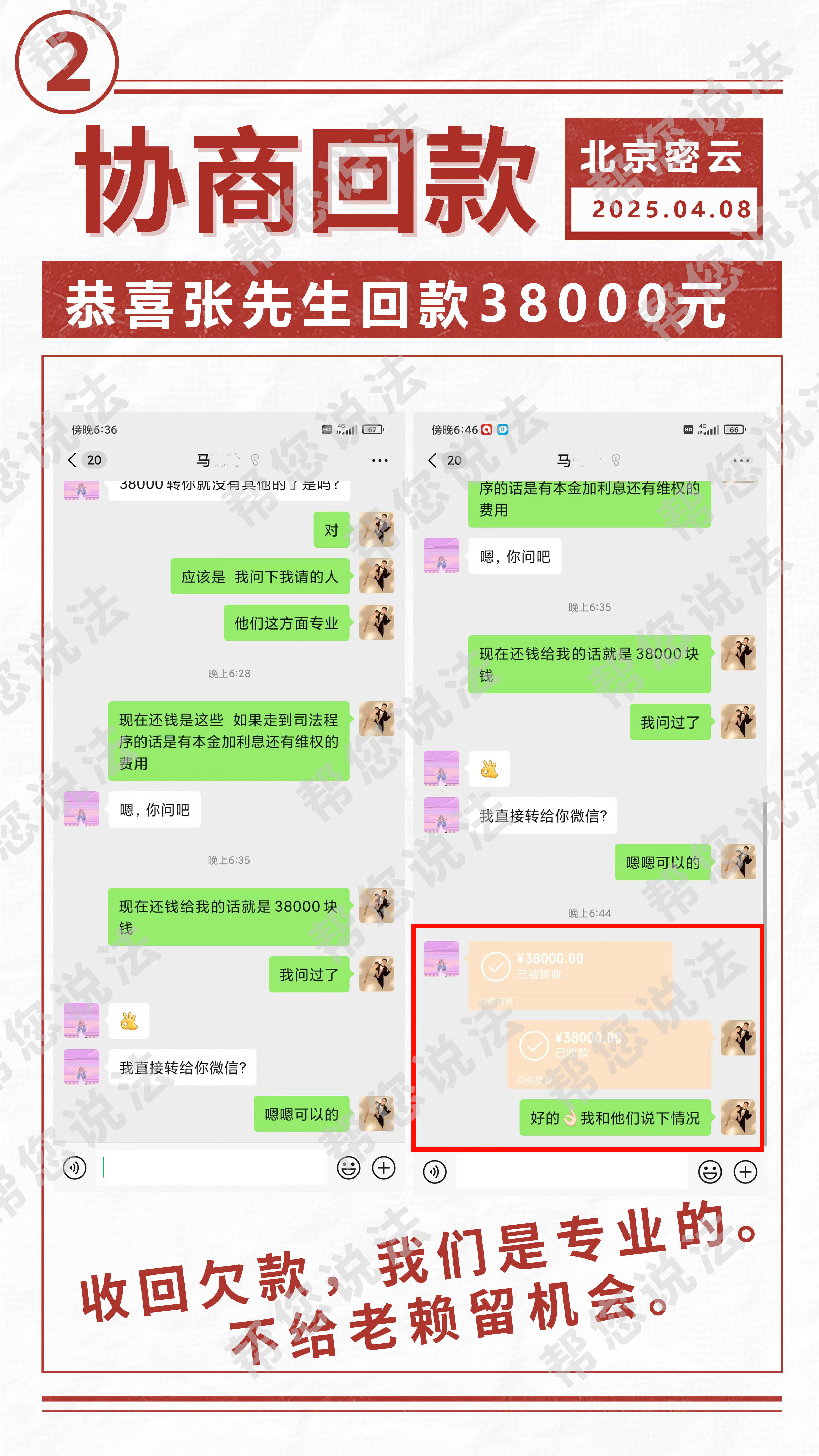 张先生与马某某存在多年的债务关系,马某某拖欠其38000元款项。期间,张先生多次催款,马某某却始终以昔日情谊为筹码打感情牌,时而诉说自身困境,时而承诺尽快还款,用各种说辞拖延,让重情义的张先生难以强硬催讨,陷入束手无策的境地。无奈之下,张先生选择委托帮赢说法。我们当天介入后,迅速了解案情,明确债务事实,随即与马某某沟通,清晰告知其拖欠欠款的法律责任,打破其以感情拖延的侥幸心理。