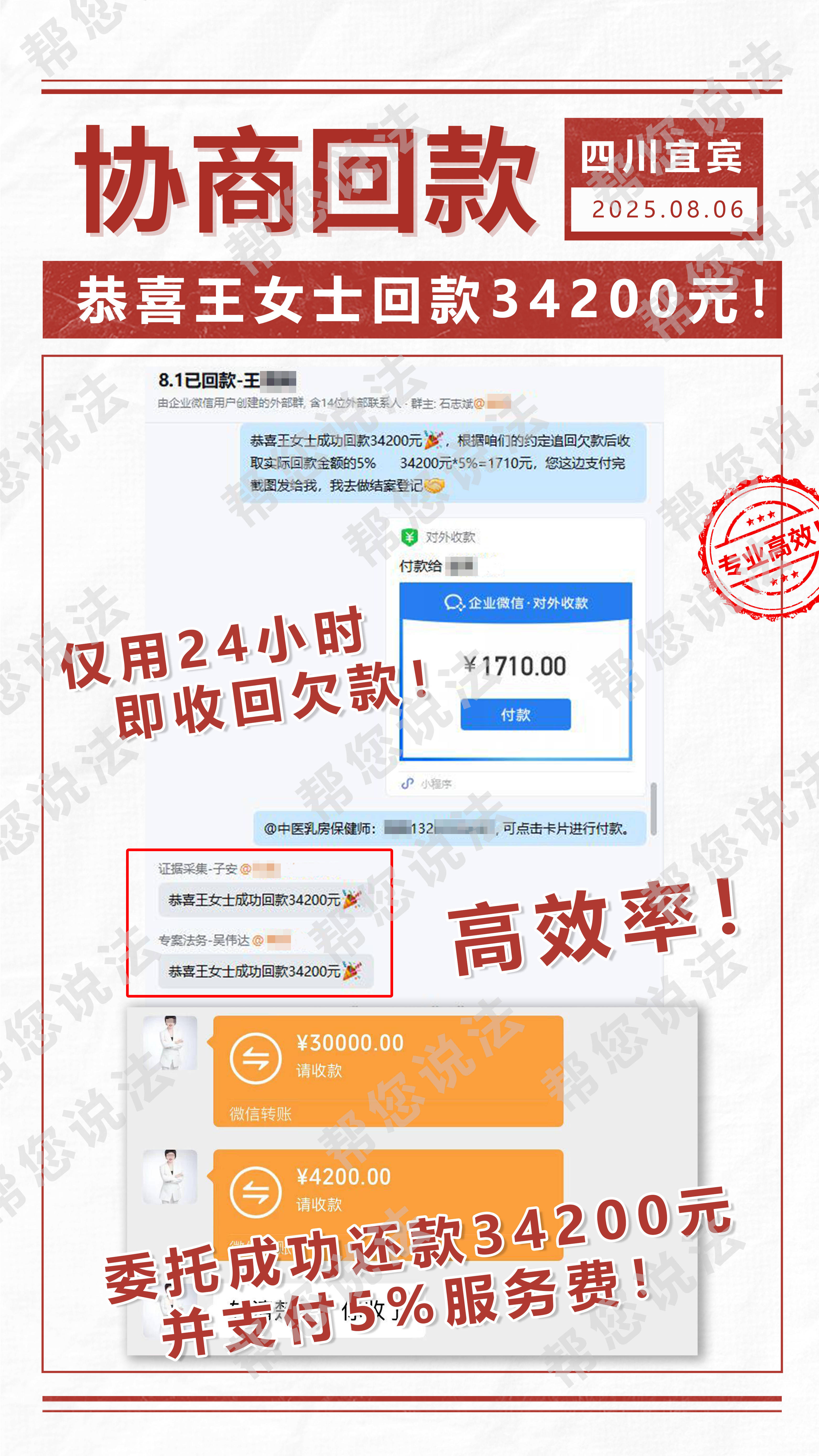 在帮赢说法的帮助下,欠款方当天便将34200元货款全额支付给王女士,欠款全部追回。
